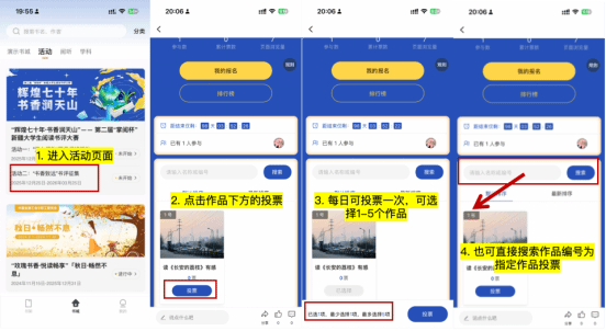 1. 参赛者可以上传自己的书评,也可以直接对他人的作品进行投票;