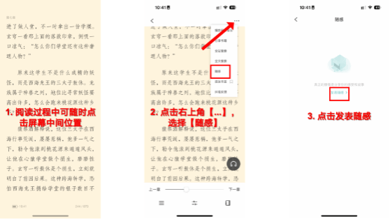 阅读过程中可以随时长按文字,选中文字发表批注;或点击屏幕中间,进入写随感的界面发表随感