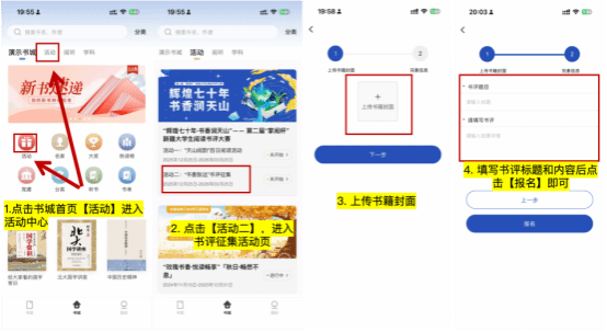 点击书城首页【活动】,进入随感活动页面,按提示上传书封并填写个人信息及书评内容即可