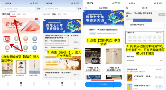点击书城首页【活动】,进入活动页面后点击【立即参加】即可参与阅读打卡活动