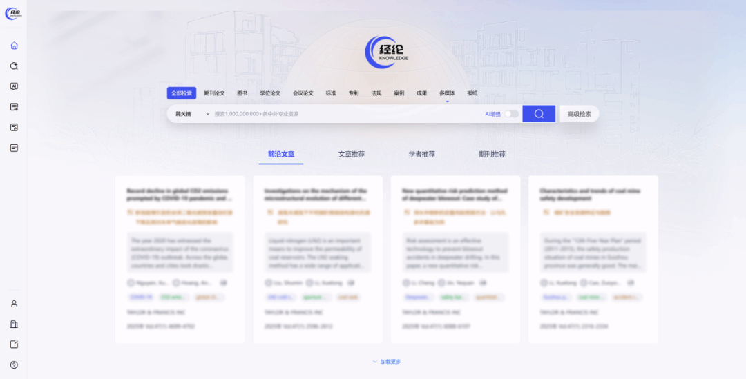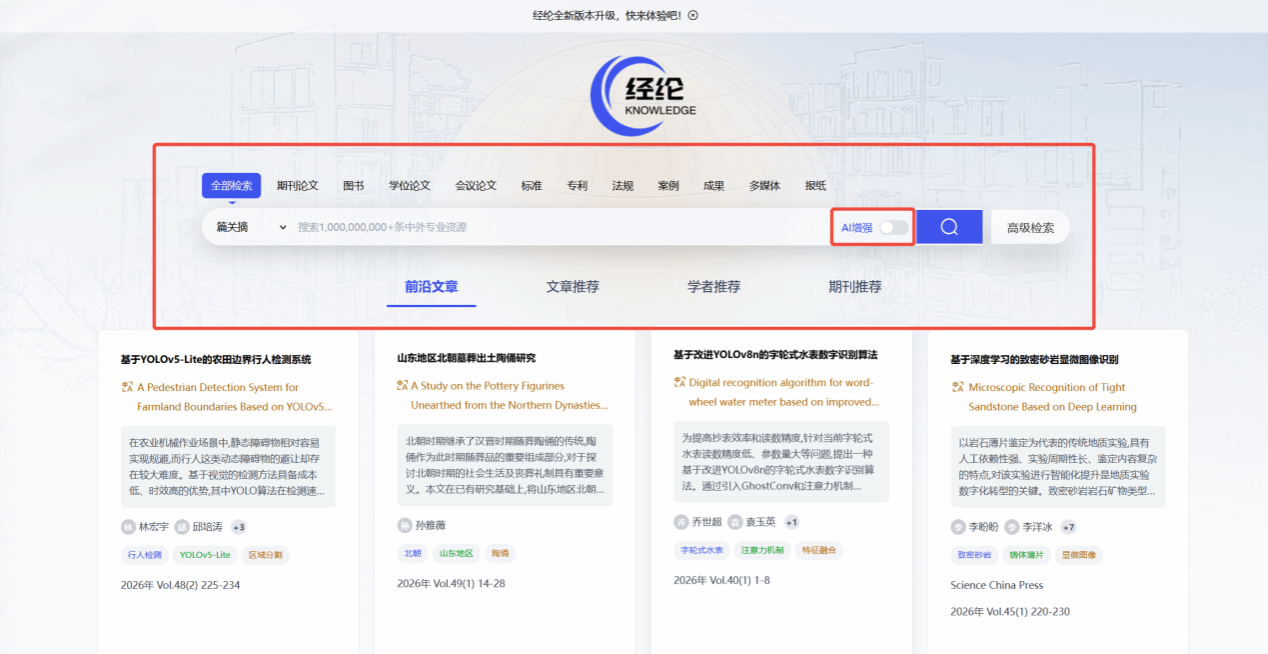 1.简单检索,进入经纶知识服务平台首页,输入中英文关键词即可开始检索文献。