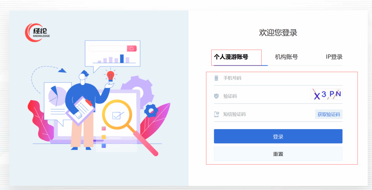 点击注册个人漫游账号,便于校外访问,可以随时随地使用经纶知识服务平台。