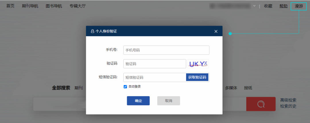 读者需要先通过校园IP进入维普经纶知识服务平台,点击页面顶部的“漫游”按钮,通过手机号进行个人身份认证。