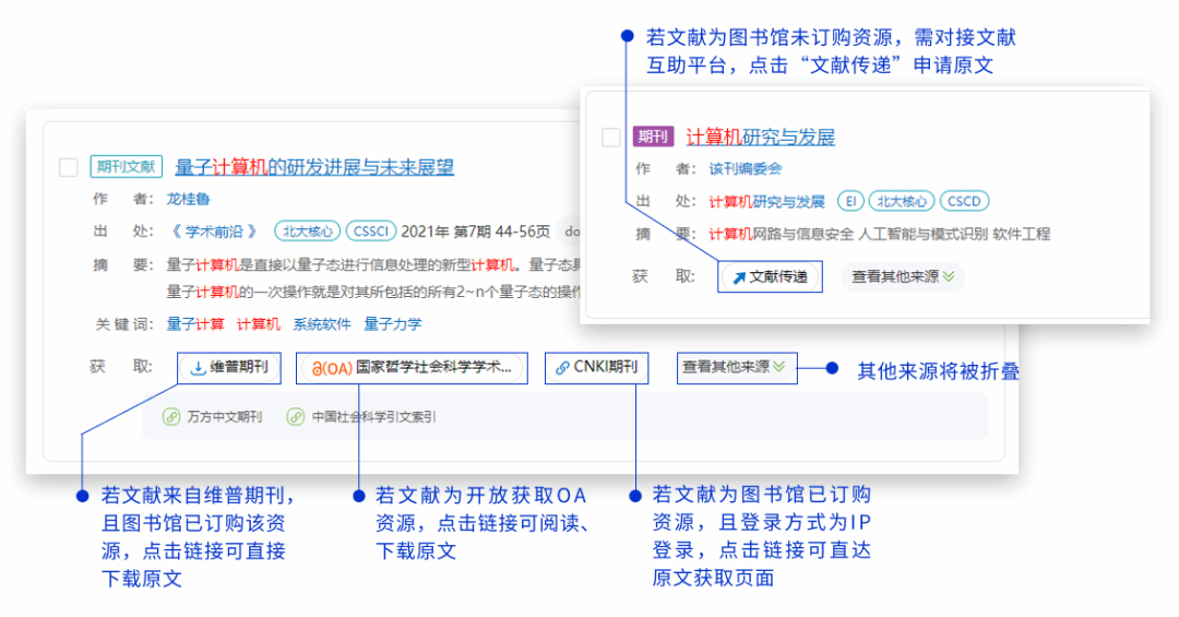 4.针对不同来源的文献资源,经纶提供不同的文献获取方式,支持原文直达、开放链接、共享互助。