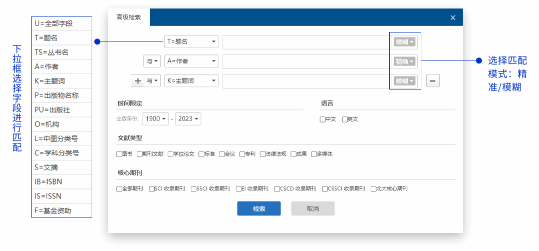 2.点击检索框右侧的“高级检索”按钮,在弹出的页面中,组合多个条件进行限定性检索。